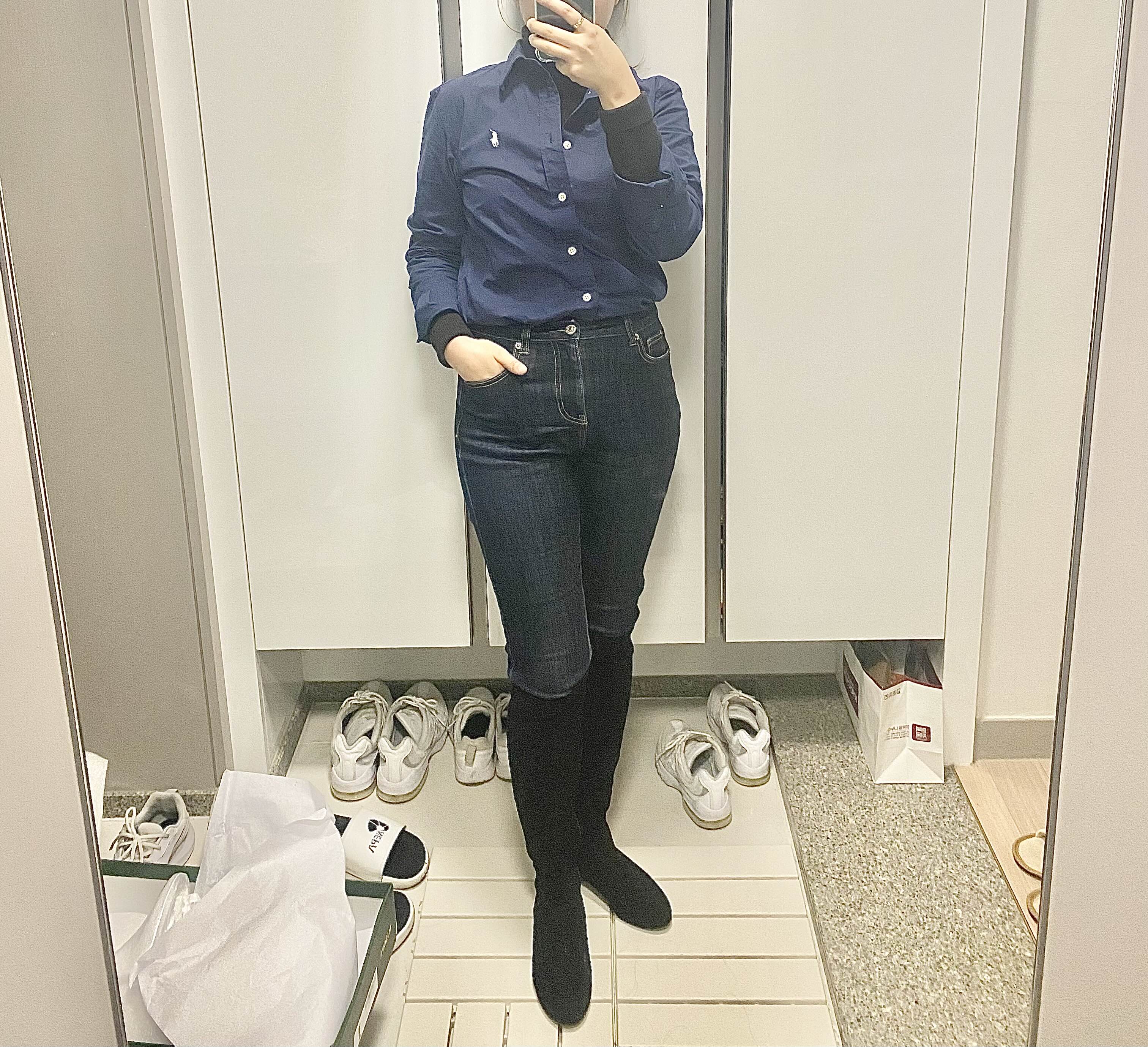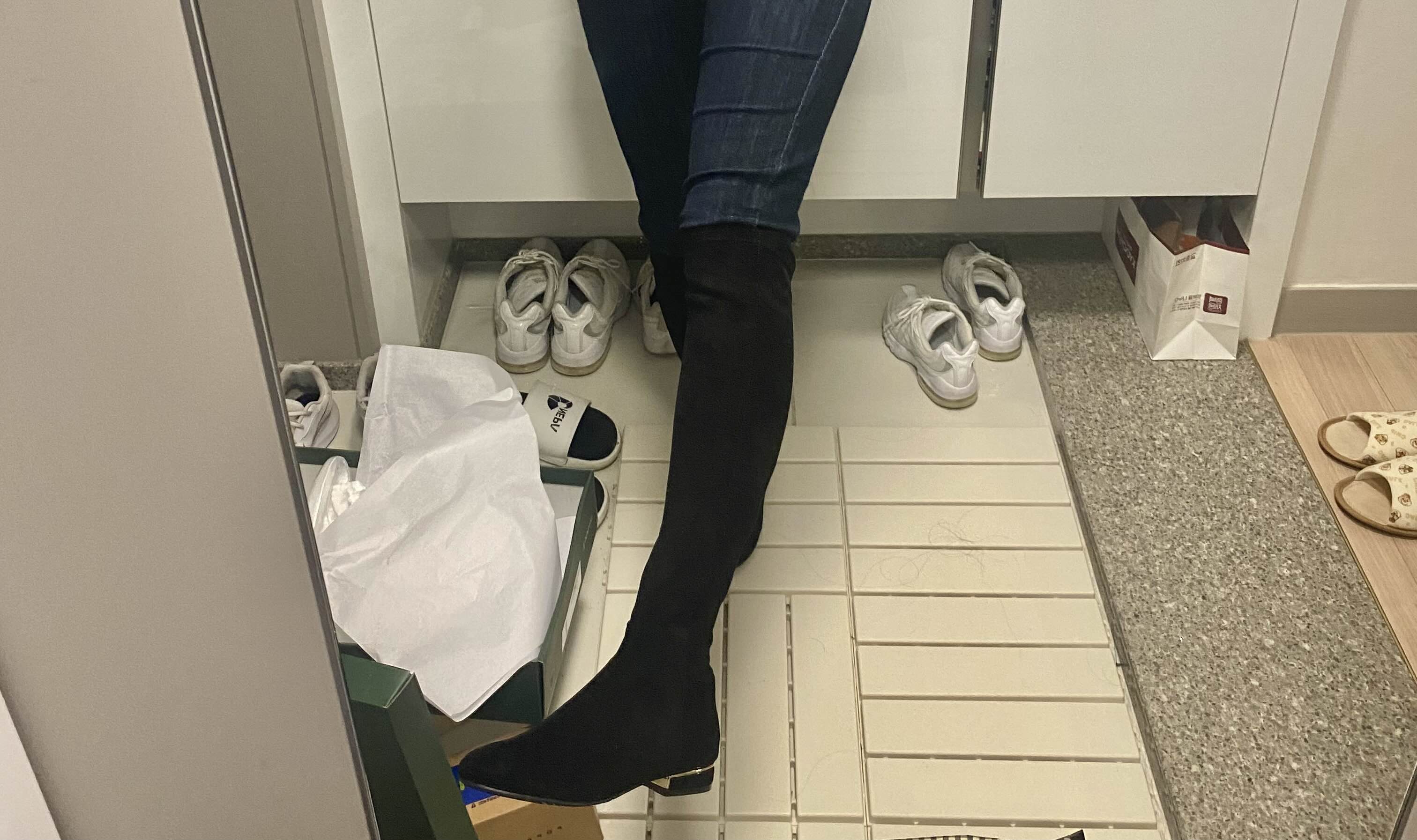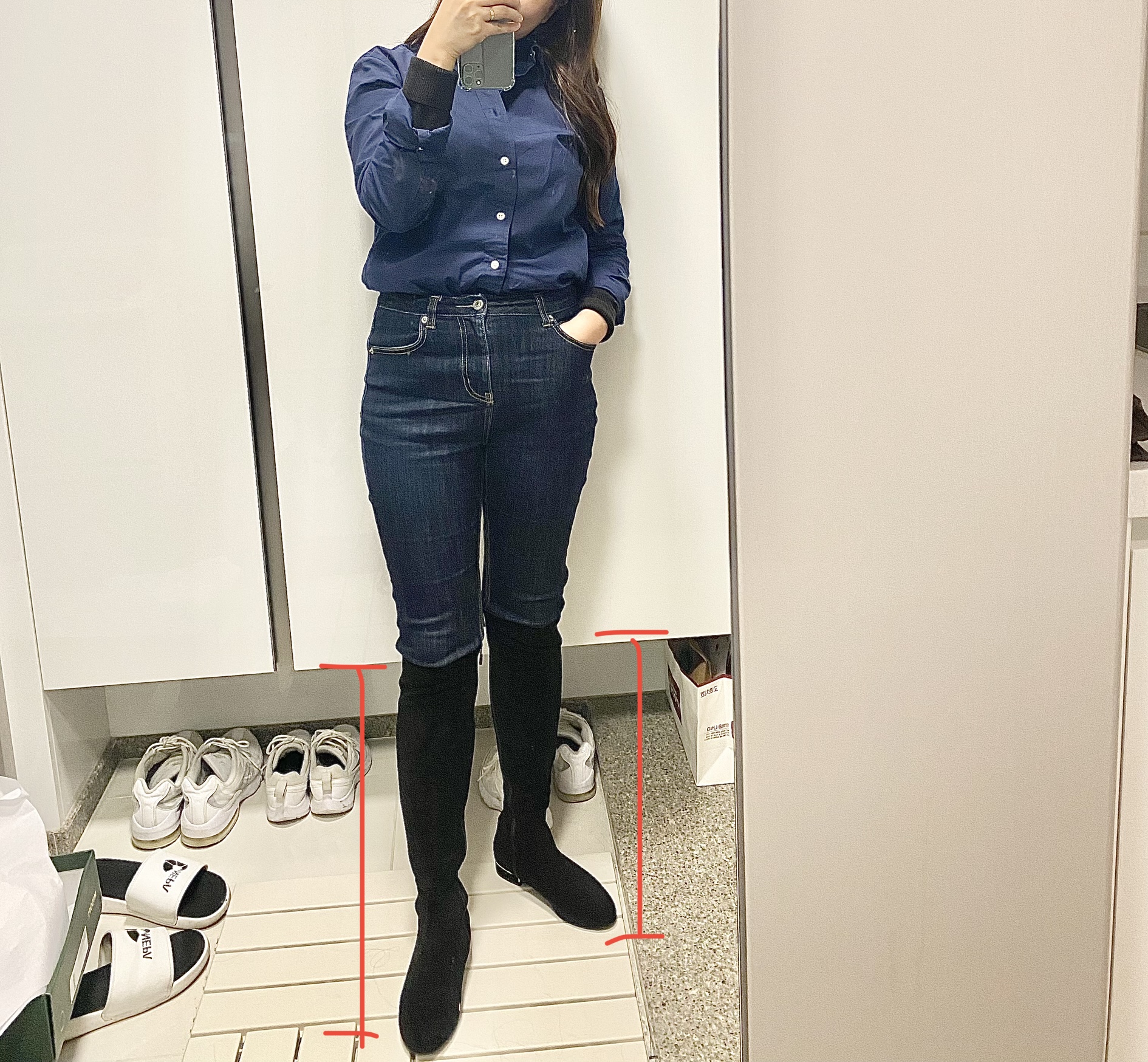 키가 작은 저도 롱부츠를 신을 수 있다니 정말 행복🤭❤️ㅋㅋㅋㅋ 사진상으로는 잘 안보여서 표시해 뒀어요. 이런 길이감입니다!^^